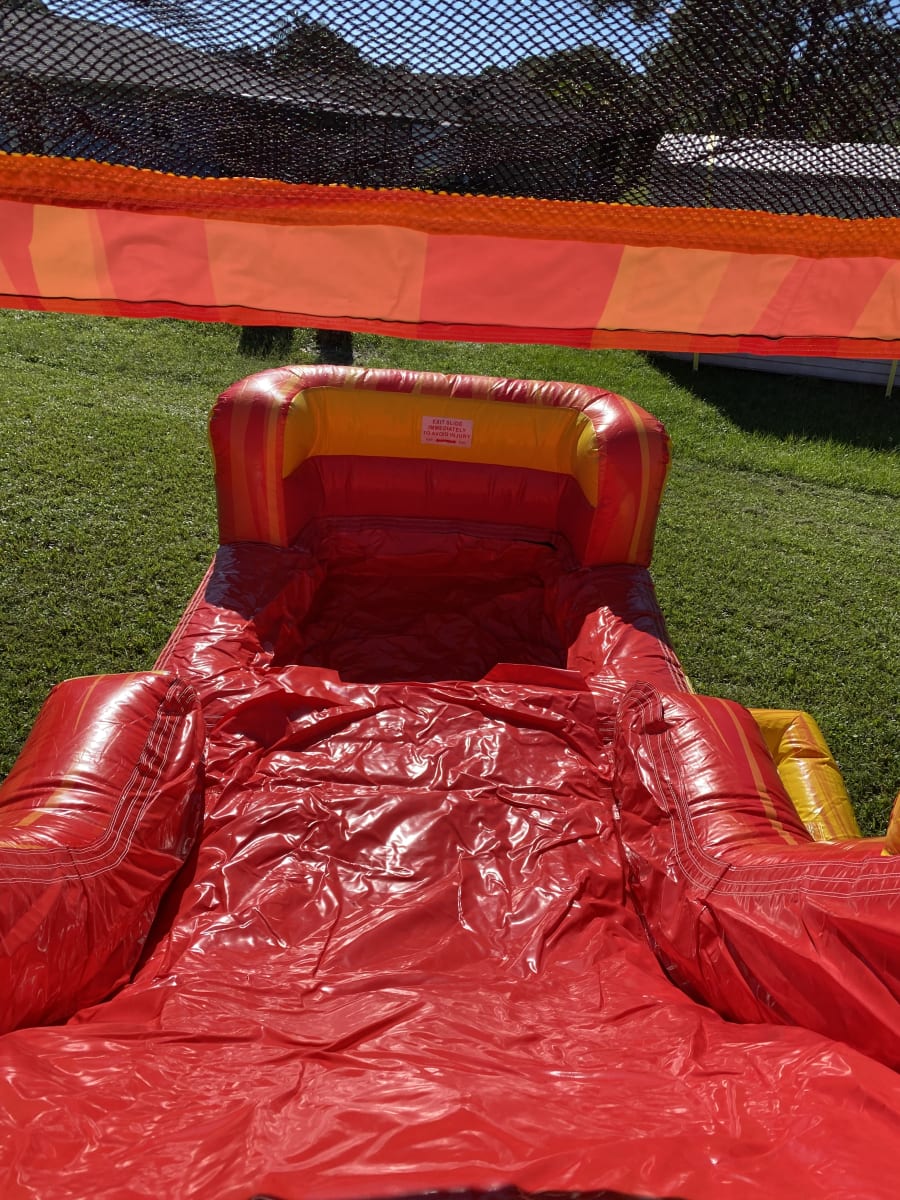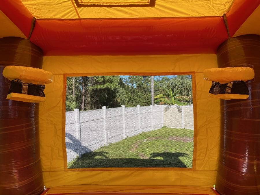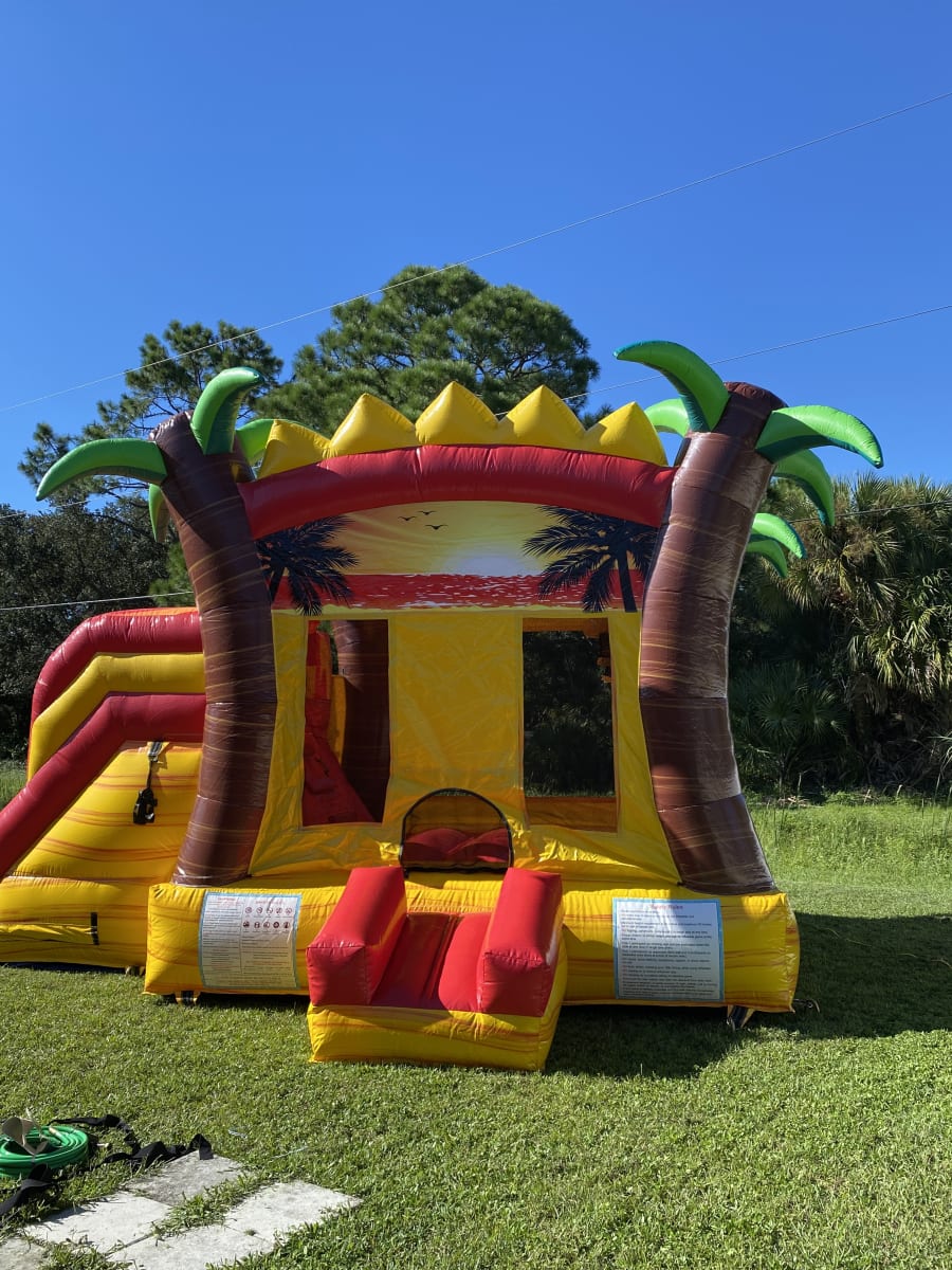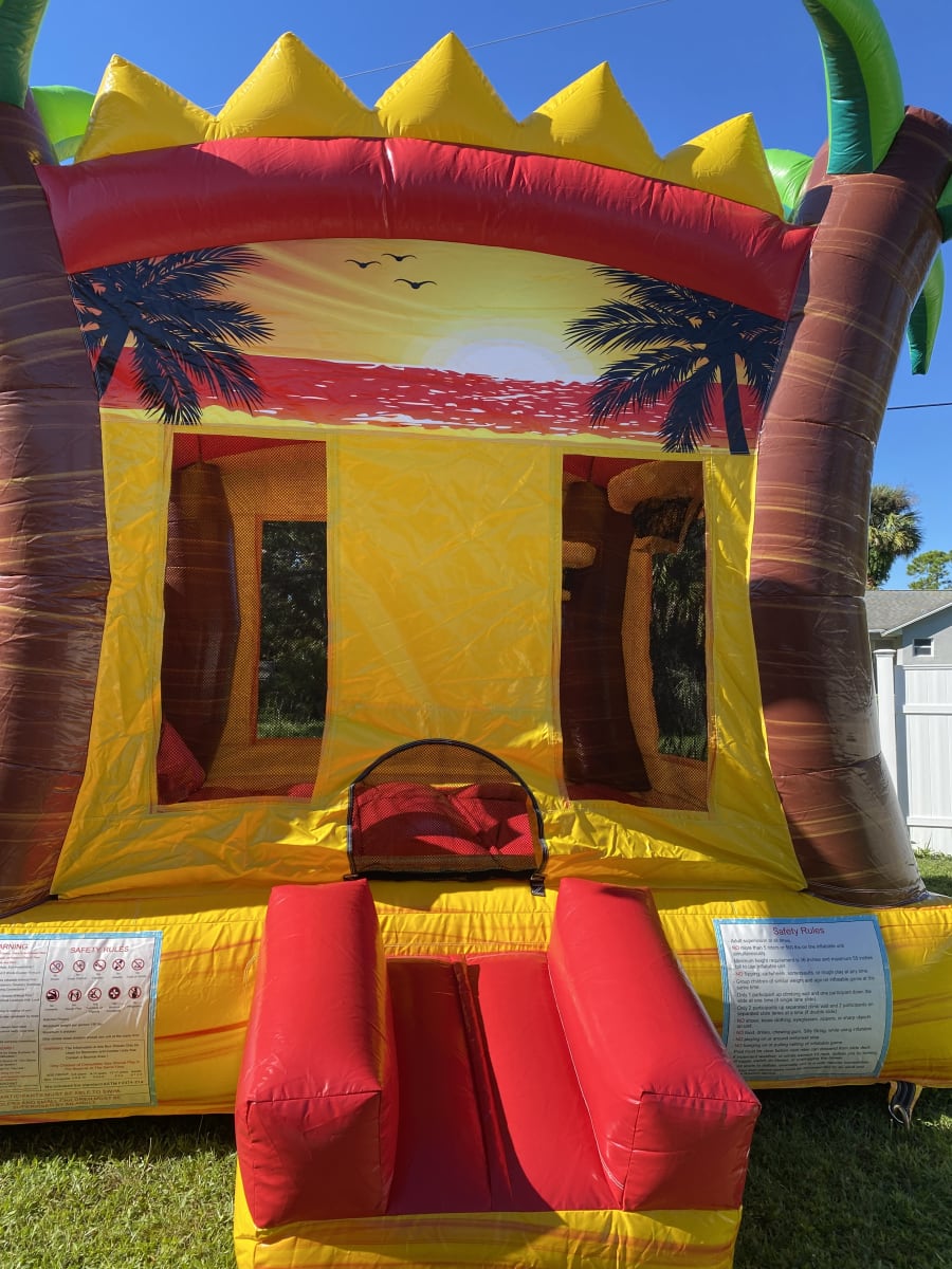 This combo has marble yellow and orange color scheme along with an 3D palm trees and a sunset banner. This combo has a large bounce pad with two basketball hoops and a dual-lane or single lane slide. The Crush single water combo is guaranteed to be a hit.This bounce house/water slide combo can be delivered to you in Palm Bay, Melbourne, Cocoa, Malabar, and all of Brevard County. Contact us at 321-420-2321 for all your party needs.