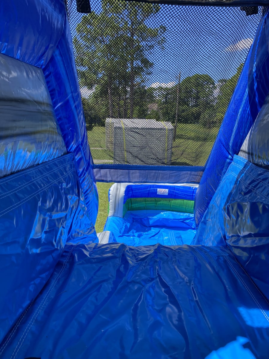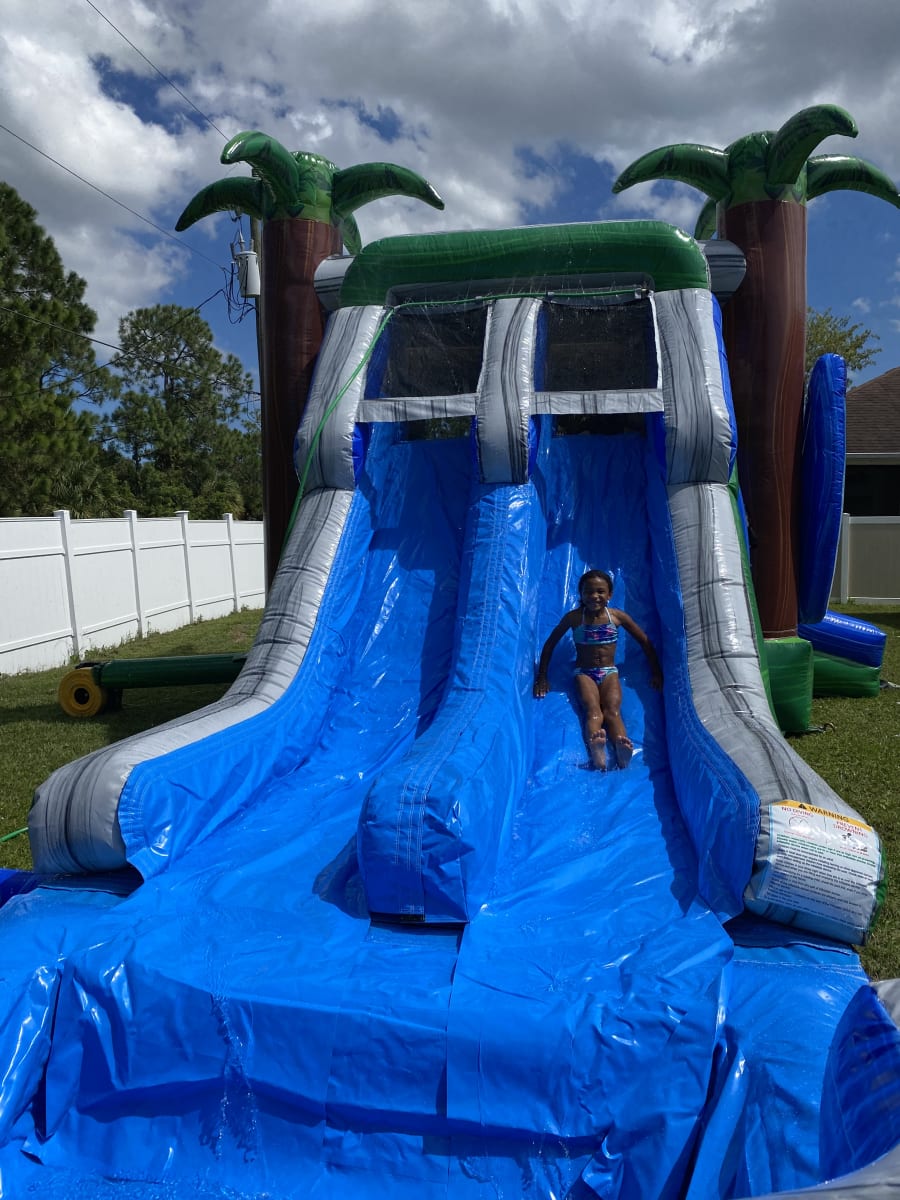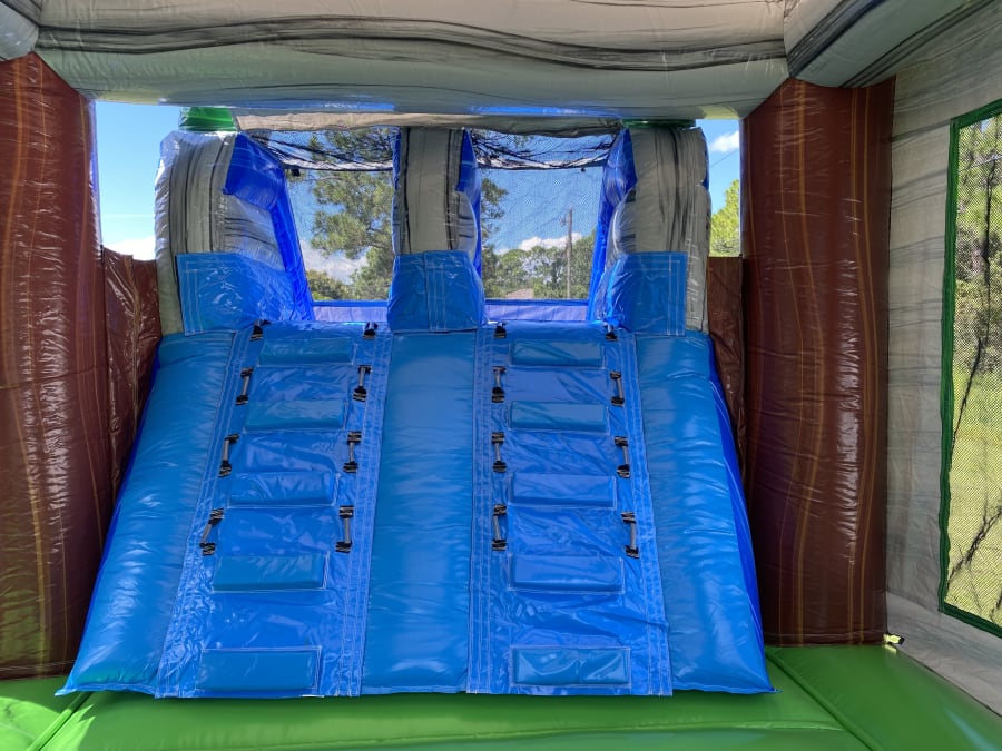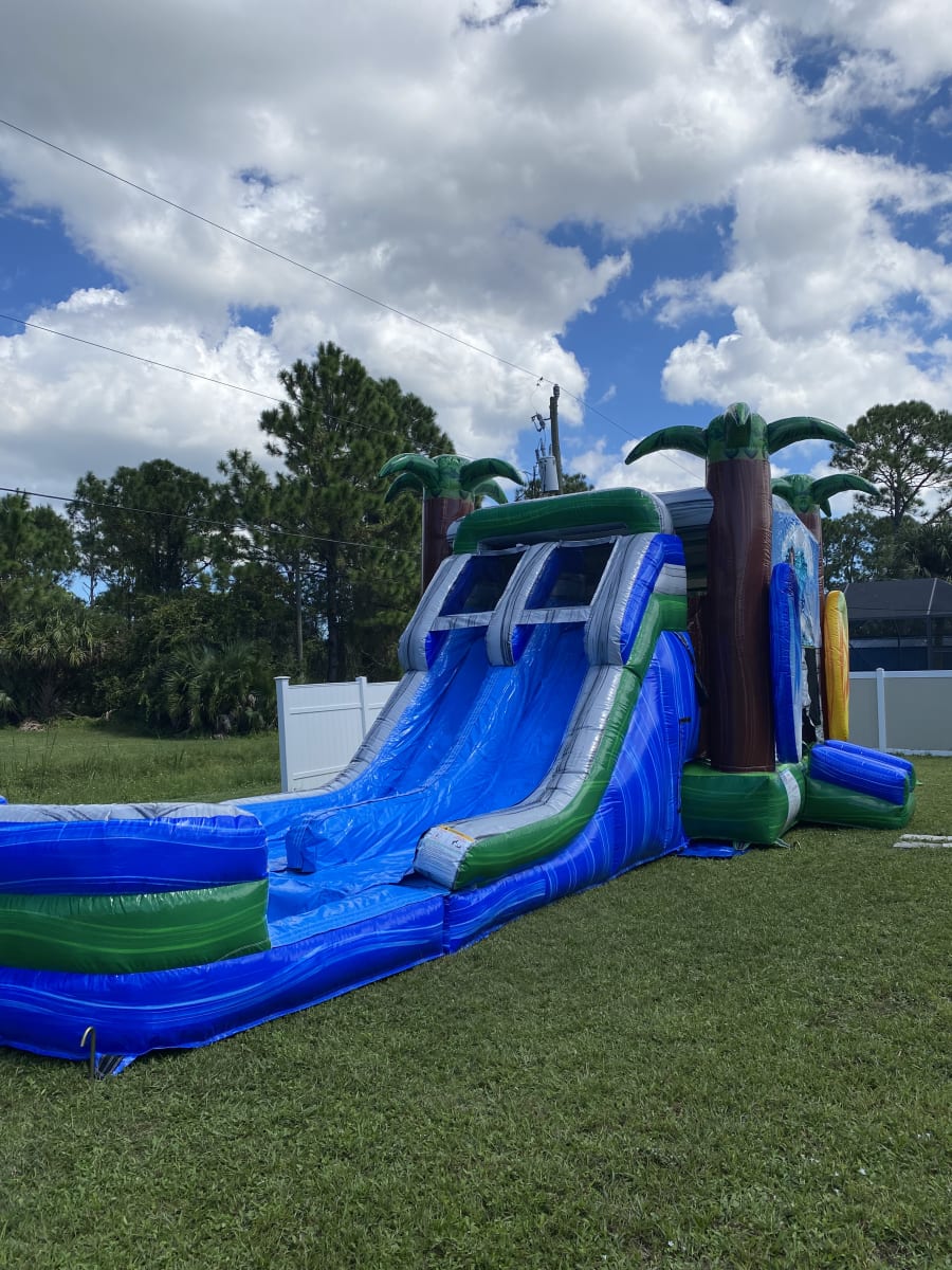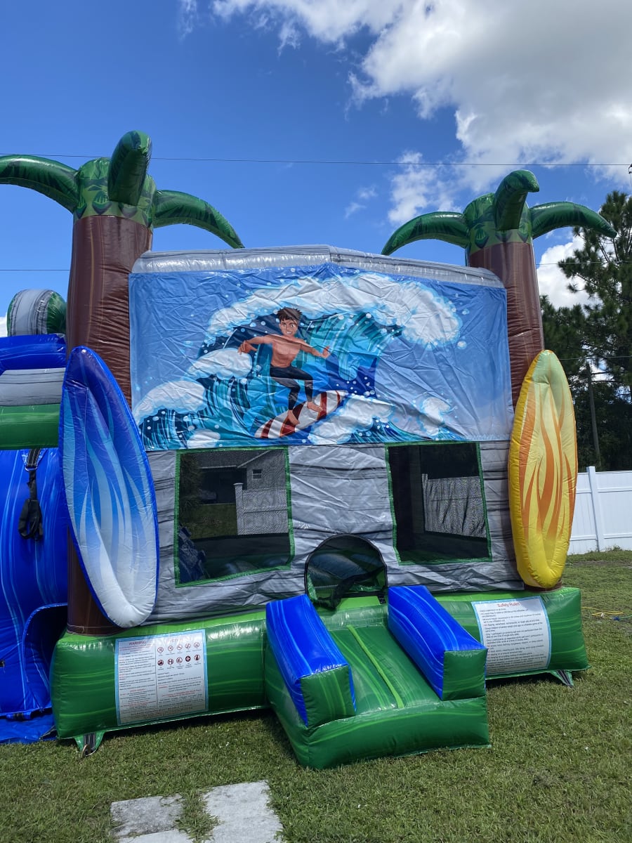 The Surfs Up themed Wet-Dry Combo Inflatable Includes marble blue, grey and green color scheme along with 3D inflated surf boards and palm trees. This combo has a large bounce pad with two basketball hoops and a dual-lane. It is the perfect ride to emphasize for all occasions! This bounce house/water slide combo can be delivered to you in Palm Bay, Melbourne, Cocoa, Malabar, and all of Brevard County. Contact us at 321-420-2321 for all your party needs.