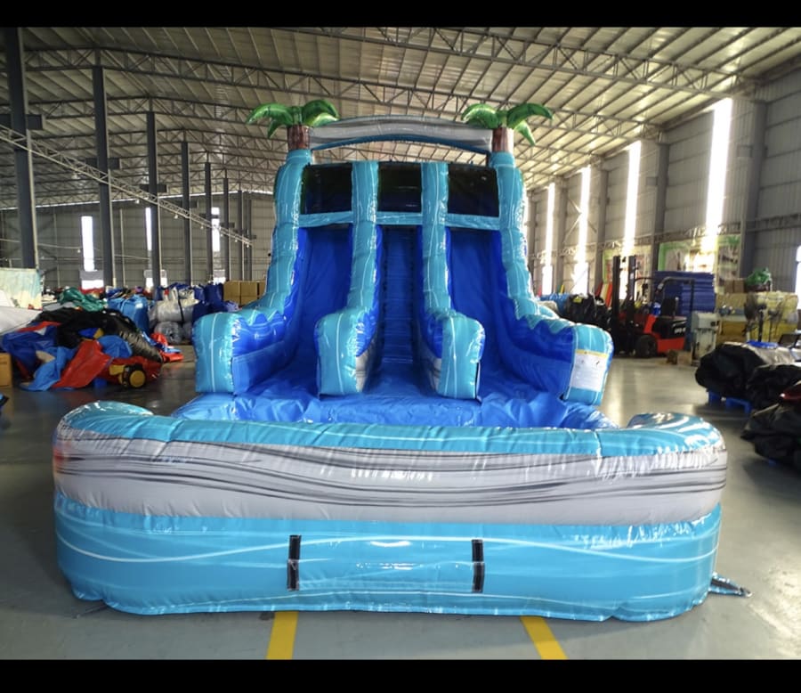 The 16 ft Bahama Blast Center Climb Water Slide is custom-designed for stability and steady rental usage. Including a marble teal, green, and blue color scheme with 3D palm trees, this water slide is double lane and has a large pool at the bottom. It is the perfect ride to emphasize for all occasions. Monkey n Round serves all of Brevard. Go to Monkeynround321.com to reserve today.